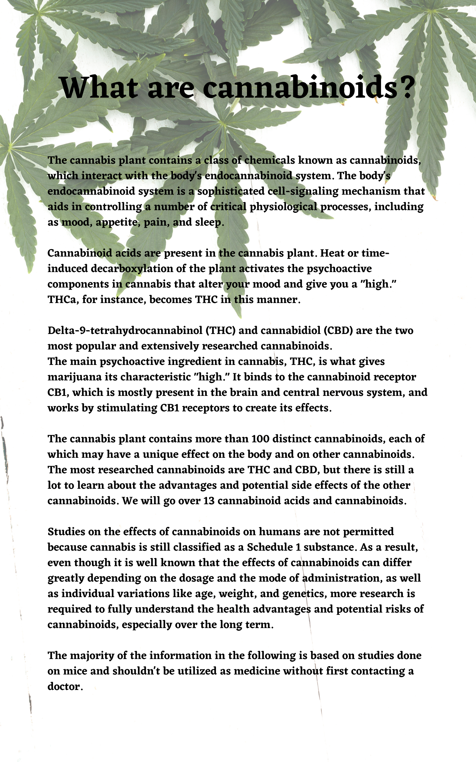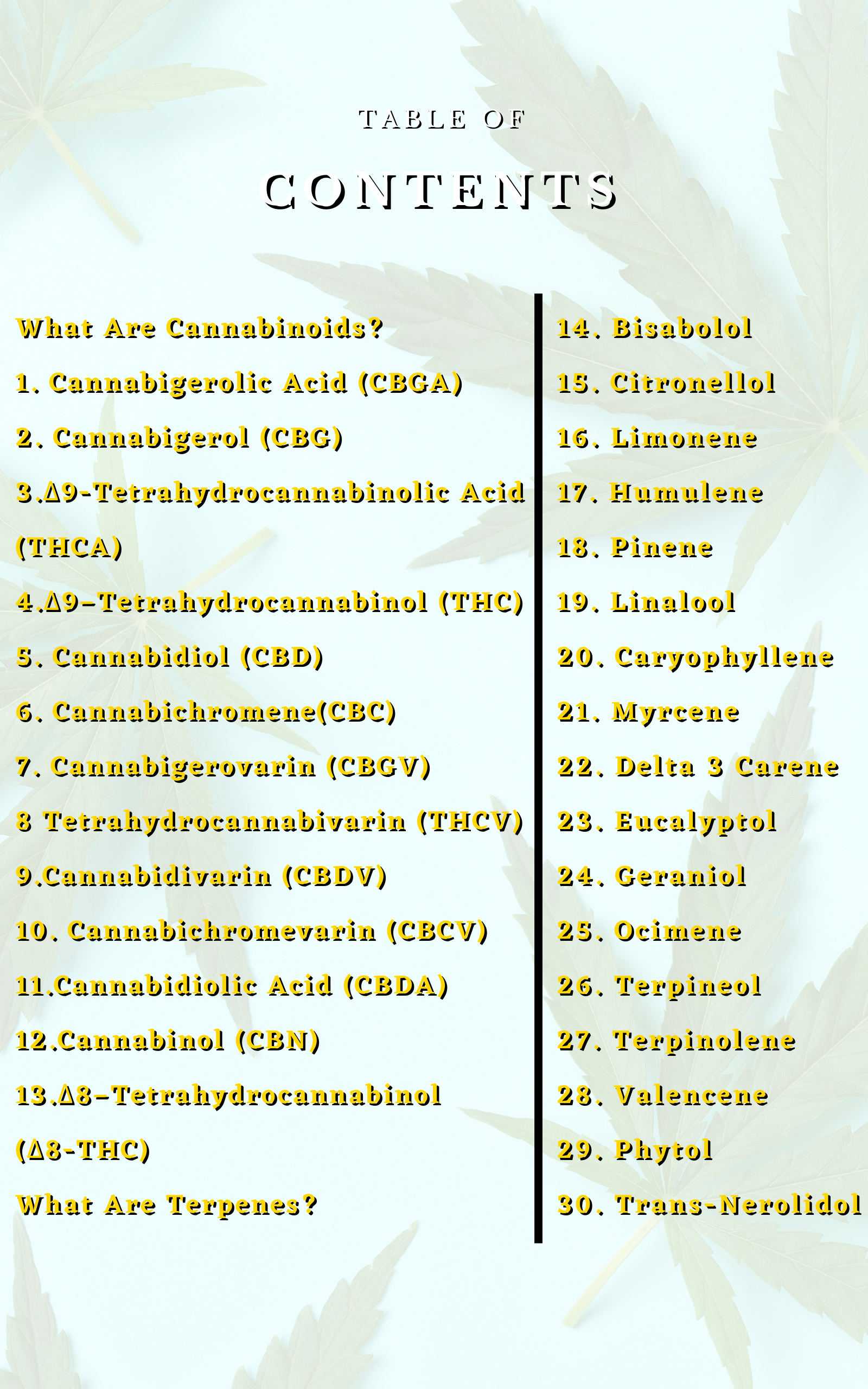 This comprehensive ebook offers an in-depth look at the most important cannabinoids and terpenes found in cannabis. With this incredible book, you'll get to know your favorite plant like never before! Learn about the chemistry, effects, and medicinal properties of cannabis by delving into the health benefits and preliminary studies behind 30 of the most popular cannabinoids and terpenes.