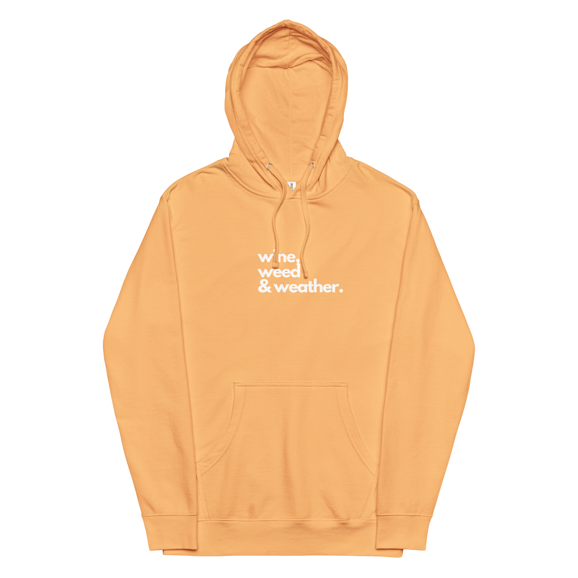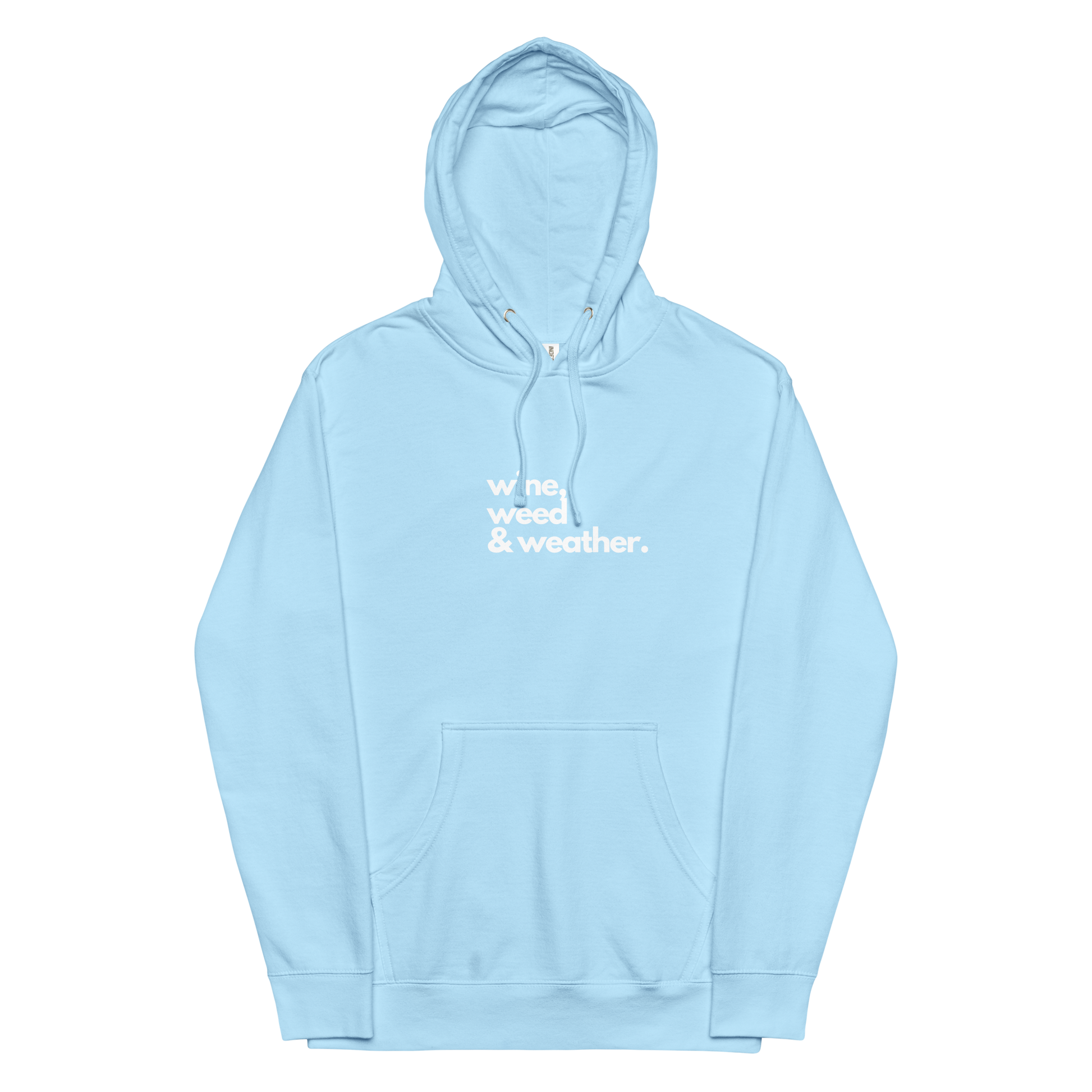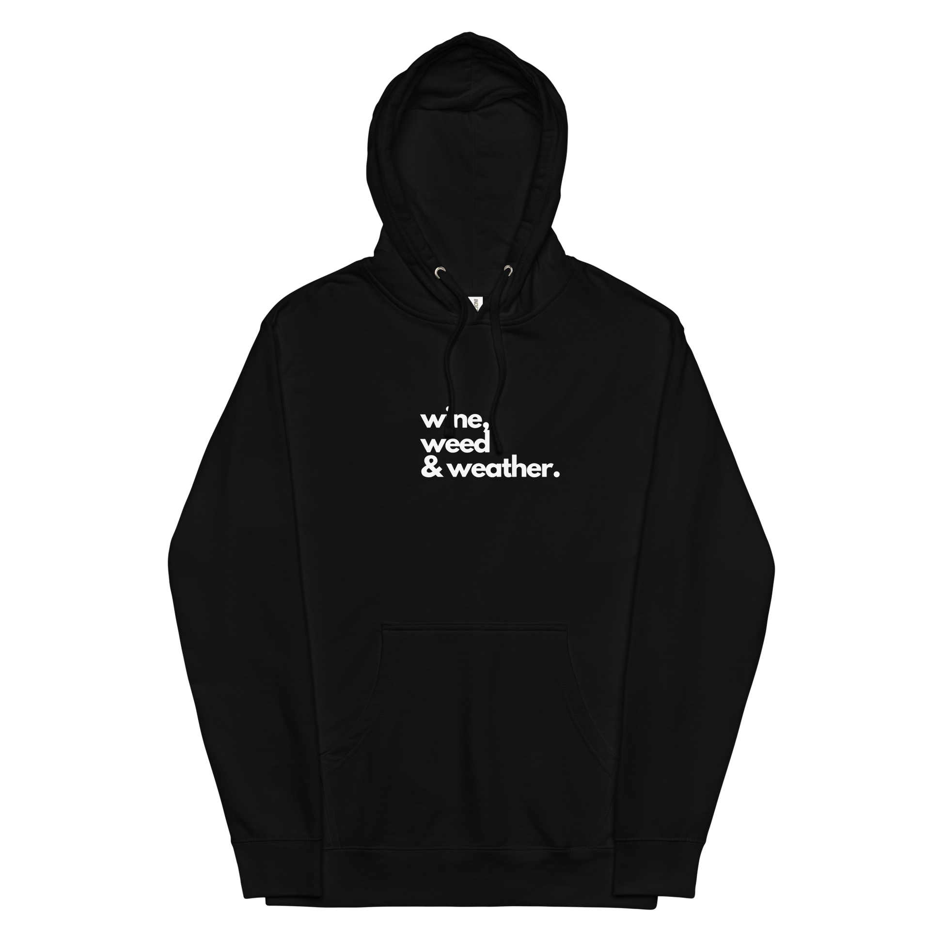 Looking for the perfect high-quality hoodie? This unisex hoodie is a mix of comfort and function. Soft and cozy on the inside, sleek and stylish on the outside displaying your taste for some of nature's finest offerings; Wine, Weed, & Weather.